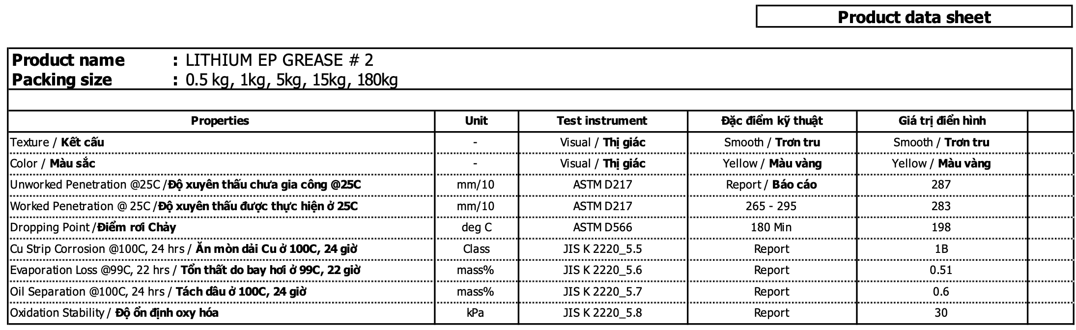 As we are and OEM grease manufacturer, we always begin by discussing and studying your specific market needs. From there, we tailor our grease formulation to excel in each application and exceed customer expectations. Whether for industrial, automotive, or marine environments, our goal is to develop a custom solution that performs flawlessly. Once we established the performance criteria, a suitable specification data sheet similar to the one below will be published.